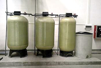 該產(chǎn)品是采用強(qiáng)酸性苯乙烯系鈉型樹脂(NaR)將原水中的硬度成分Ca2+、Mg2+置換出去,使原水得到軟化,其反應(yīng)為:2NaR+Ca2+(Mg2+)=R2Ca(Mg)+2Na+。當(dāng)樹脂置換到一定量的鈣、鎂后,就會(huì)失去置換能力;可以用一定濃度的鹽水浸泡,使其恢復(fù)交換能力,其反應(yīng)式為:R2Ca(Mg)+2Na+=2NaR+Ca2+(Mg2+)。再生過程包括:反洗(松動(dòng)樹脂層)—吸鹽慢洗(置換過程)—正洗(將鈣、鎂離子沖掉)—注水(為下次再生準(zhǔn)備)。